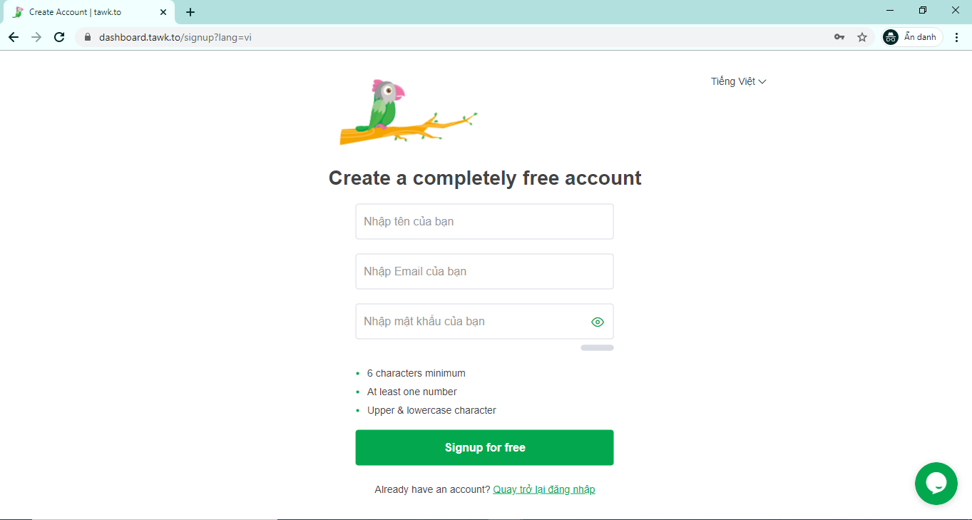 1. Đăng ký tài khoản Tawk.to: Bạn hãy truy cập vào link sau để đăng ký: https://dashboard.tawk.to/signup?lang=vi Sau khi điền Tên, Email và Mật khẩu, bạn tiếp tục thiết lập 4 bước sau: Chọn ngôn ngữ cho Tawk.to. Thiết lập tên và đường dẫn website của bạn. Thêm Quản trị viên, Hỗ trợ viên để....